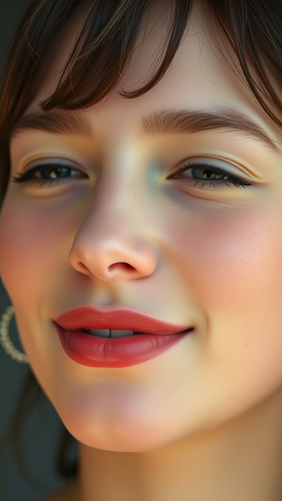 Her nose is petite and subtly upturned, giving it a charming button-like appearance. Her lips, full and velvety, carry a natural, rosy hue that beautifully contrasts her alabaster complexion. They rest gently parted in a serene smile, as if she is either lost in contemplation or captivated by the surrounding splendor.
