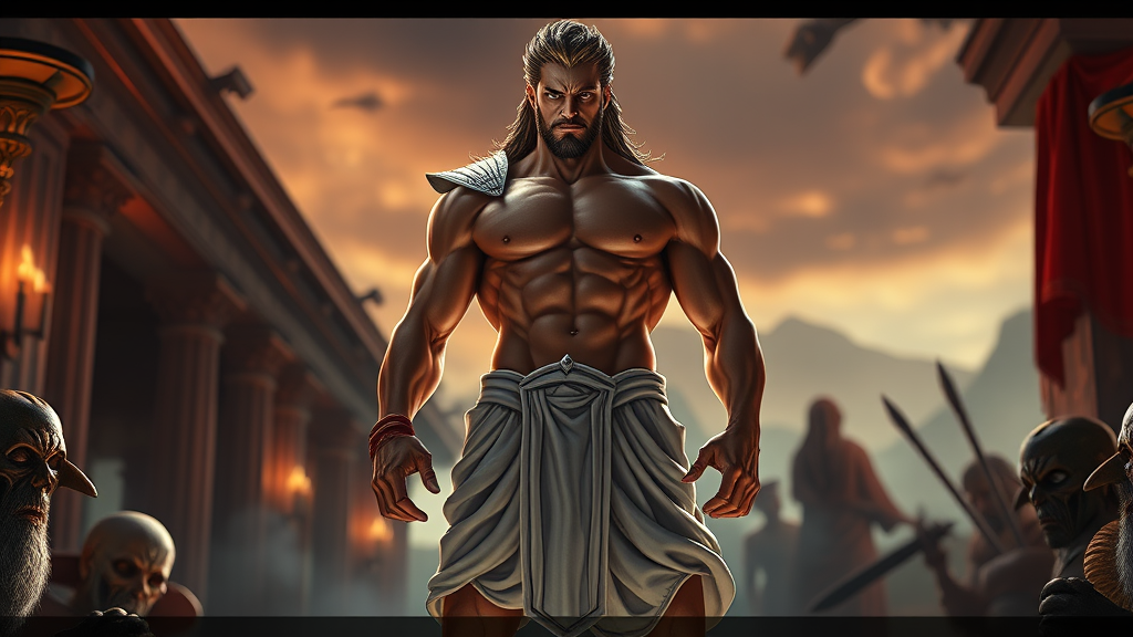 Heracles-inspired character from Greek mythology melded with a One Piece aesthetic, showcasing a symmetrically powerful physique in a full-body portrayal, featuring intricate details and dynamic, cinematic lighting. The scene is high contrast, styled for a dramatic ArtStation showcase, with a focus on character concept art richness, presented in 8K resolution. The character stands heroically amidst a backdrop that hints at ancient Greece and a world of piracy adventure, with stylized elements reflecting a blend of mythology and fantasy, captured in a vertical 9:16 aspect ratio.