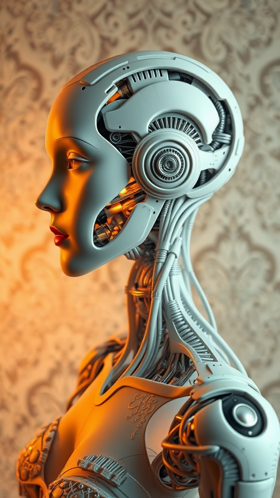 Here is the modified prompt: ultra-detailed 3D render of a stunning, humanoid android porcelain profile with intricate robotic and cyborg elements, showcased in a serene, soft-lit studio setting with rim light, surrounded by a delicate lace backdrop, echoing the elegance of H.R. Giger's style, with an emphasis on anatomical accuracy, facial muscle structure, and hyper-realistic textures, featuring a rich, vibrant color palette, with a focus on intricate details such as cable electric wires, microchips, and beautifully rendered robotic limbs, all captured in 8K resolution, with a blend of organic and metallic materials, set against a subtle, sepia-toned background, with a focus on fine art-like illustration and an extremely detailed, almost surreal, atmosphere, reflecting a sense of wonder and awe, while subtly subverting traditional anatomical norms with creative twists, such as oversized genitalia and an emphasis on avant-garde, abstract shapes.