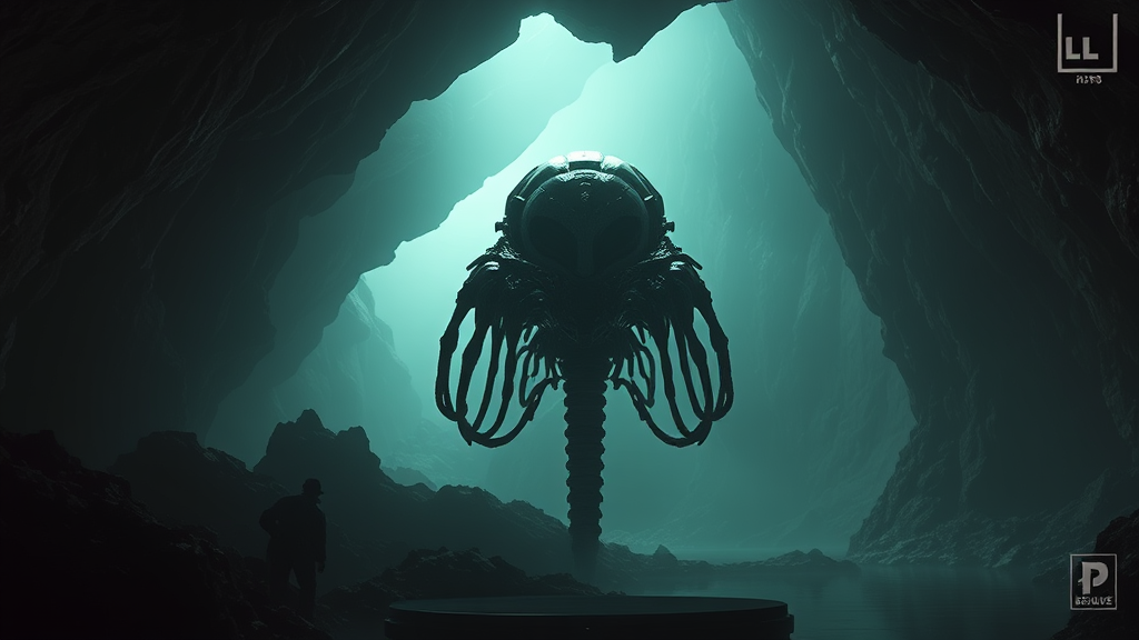 Here is the revised prompt: c4ttitude as a Borg drone, Trekborg, in a dimly lit, fog-shrouded mountain cave, with moody, high-contrast lighting effects, and a Sci-Fi environment, beneath the flickering glow of LED displays and holographic projections, in breathtaking 16k UHD, HDR quality, with a cinematic atmosphere, and extreme attention to detail, featuring a cloned, alien face with crossed eyes, extra fingers, and mutated hands, amidst a backdrop of ancient, weathered cave formations and twisted, alien technology, all captured in a mixed-media style with deliberate cropping, low-resolution textures, and text overlays, with signature symbols and trademarks etched into the corners, and a degrade finale with watermark and art squad logo, with a separate reference sheet and a distant, out-of-frame view revealing the drone's long, serpentine neck.