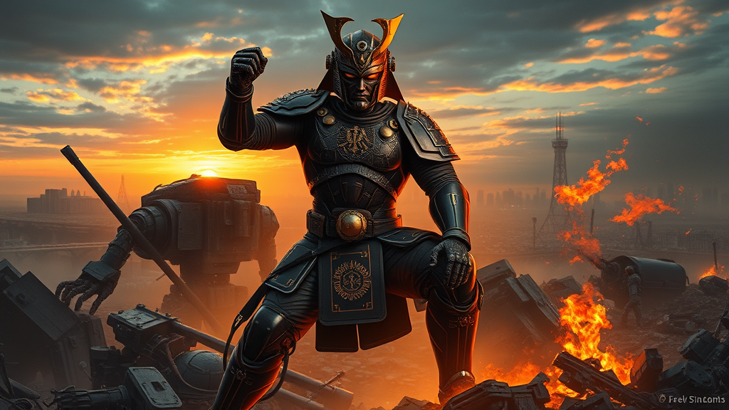 Here's a modified version of the prompt: Cybernetic samurai poses triumphantly on the throne of downed mechs in a shattered landscape, his intense gaze illuminated by the golden light of predawn. His sleek black armor, adorned with intricate, hand-tooled designs in copper and silver, glistens with a slight sheen, evoking the classic aesthetic of Soviet propaganda posters. His physique is a study in perfect proportions, honed from years of intense training and battle. In the background, a smoldering hulk of a robot mech lies in ruins, its once-limbs now twisted and charred. A sprawling metropolis, abandoned and crumbling, stretches out into the distance as the dark, foreboding sky begins to pale into a fiery sunrise.