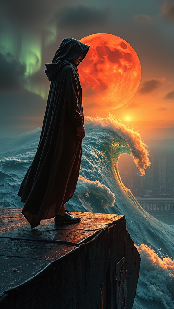Here's a modified version of the prompt with a few creative tweaks: "Steady auroral light drapes a golden ocean wave as it crashes onto a foreboding, cybernetic shore, where an ethereal 1girl stands tall on a weathered, neon-drenched ledge, lost in the city's melancholic, dark-futuristic sprawl under a tenebrous, crimson blood moon. She wears an intricately embroidered, hooded science fiction cape, reminiscent of an ancient Sith Lord's dark attire, billowing in the turbulent, hurricane-force winds that distort the peeled sky and fracture it into jagged, glistening shards. The atmosphere is heavy with anticipation as the stormy, digital darkness crackles with energy, illuminated only by the resplendent, orange-hued sun dipping below the horizon, and the soft, lunar glow pulsating through the sky like a blood-moon heartbeat. The hyper-realistic, hand-crafted details of her clothes, the architecture, and the futuristic, biomechanical landscape are all brought to life with painstaking precision using Unreal Engine rendering, making this cyberpunk, stylized urban fantasy scene an immersive, breathtaking masterpiece."