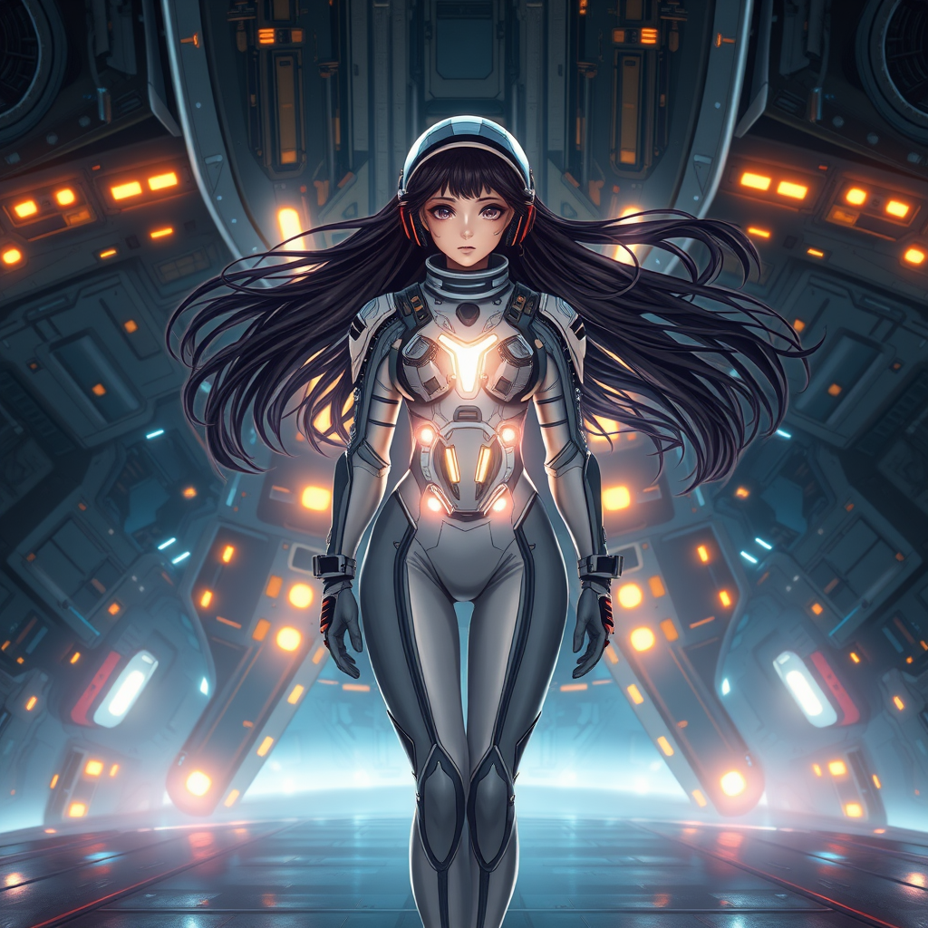 Here's a refined version of the prompt: A stunningly beautiful girl in a sleek spacesuit stands against the backdrop of a giant hyper-detailed sci-fi spaceship, inspired by the styles of Tsutomu Nihei and Sidonia no Kishi. The scene is bathed in cinematic lighting, highlighting the girl's dynamically flowing hair. Her spacesuit features glowing accents on the chest, with a radiant light emanating from her torso. Accessories like a helmet, piercings, and headphones enhance her futuristic appearance. The girl has a slender physique with narrow hips and wears elegant heels. The setting is adorned with metallic elements like gold and rivets, creating a symmetrical and visually stunning scene.