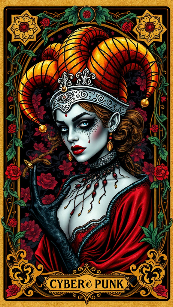 Here's a revised and modified version of the prompt: Cyberpunk tarot card with opulent barrel-vaulted frame adorned with tendrils of ivy and endless circuitry, featuring a haunting portrait of a femme fatale in a vibrant carnival jester hat, styled in Neo-Gothic Art Nouveau with intricately detailed metallic accents and prosthetics, rendered in hyper-realistic high definition with 8K resolution, vibrant and immersive coloring scheme, intense focus on textures, against a dark floral background pattern with crimson undertones, abyssal black veins replacing her circulatory system, dripping with ersatz oil and dark mystery, biodiversity blurring the line between reality and cyberpunk surroundings, lush environment reflecting an irrational wanting harmonic chain, florid linework similarities to Japanese slipcases - surrealism is oozing with the occult illumination style, reflected artificial lighting reproducing integrative inner contrast play of spear musk.