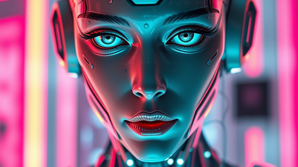 Here's a revised prompt inspired by the original: A close-up cinematic portrait of an intricate robotic girl, blending android and humanoid features with a seamless integration of technology and beauty. Her face is a masterpiece of engineering with highly detailed robotic eyes, nose, and mouth, showcasing the subtlety of their mechanical design. The vibrant futuristic room as her backdrop enhances her luminous form, rich in color and contrast. Every detail, from her intricately designed robotic body to the futuristic theme, stands out in ultra-high definition, capturing the essence of a professional work of art. Her expressive eyes have a human-like depth, framed with delicate eyelashes, and her nose and lips exhibit both robotic precision and human-like grace. Avoid imperfections such as distortions or deformations, focusing instead on elegance and sophistication without any digital artifacts or extraneous elements. The composition should embody an awe-inspiring balance between humanity and advanced technology, set within a visionary space.