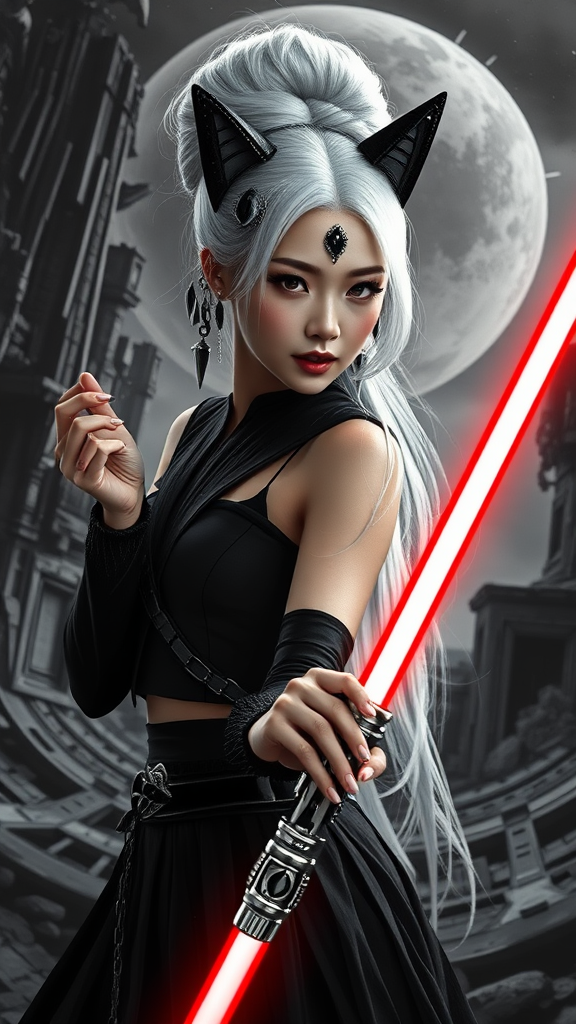 Here's a rewritten prompt that incorporates the provided inspirations while making small creative modifications: Asian girl Sith lord with long white hair styled in a ravishing updo adorned with glittering black gemstones, a pair of striking cat ears perched atop her forehead, poses dramatically in front of an intricately painted 8K backdrop in rich monochrome and grayscale tones depicting a derelict space station, her slender body seemingly suspended in mid-air as she gestures with one hand while the other rests on the hilt of her gleaming red lightsaber, depth of field turned up to emphasize the stylized texture of her high fashion attire employing an homage to the infamous "BadNegAnatomy" model, "easynegative style" character model imported, using the combination of custom UNET and fast negative conversion with 75%, Rmadanegative 402 lightmap texture tweak applied, raising the overall aesthetic to that of a stunning digital portrait, malevolent aura radiating from her very presence as if telepathic resentment shoots out in penetrating waves, rabid contempt fixated on an unwaiveringly glittering, white garments disturbingly embracing convoluted, relentlessly punching graph of sharp wispy reeds sliding under.") Let me know if you'd like me to make any major adjustments or further refinements!