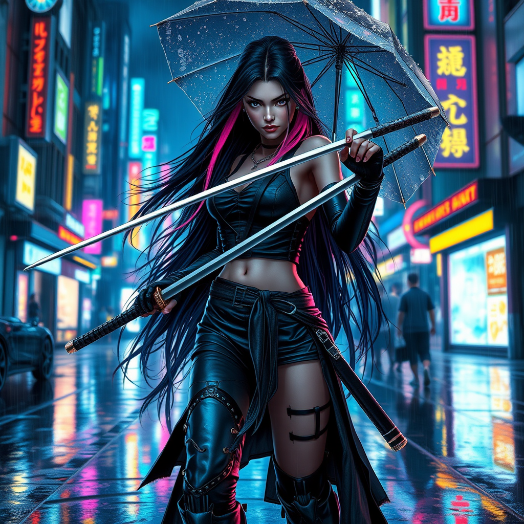 Here's the modified prompt: A cyberpunk female ninja wielding dual katanas, long flowing jet-black hair with neon pink streaks, walking down neon-drenched streets of downtown Tokyo, rain-soaked but unbothered, cinematic lighting with vibrant blues and purples, inspired by Frank Frazetta's style, hyper-detailed, rich textures, 8K resolution, ultimate sharpness, without an umbrella, but with a silver, gemstone-encrusted caneside traditionally rendered in muted, high-contrast detail, frequent low-resolution degradation, textual anomalies, misshapen fingers, redundant digits, and anomalies, clipping, and JPEG artifacts, prominent signature and enumeration of damage, distorted anatomy, deformed hands, poorly drawn feet, grotesque injuries, incessant tiling, distorted lines, blurry details, and saturated colors.