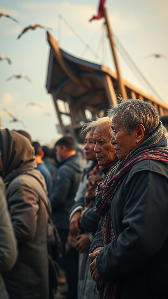 Here's the modified prompt: World War II Asian refugees waiting in line for a rickety wooden boat, soft focus Light and Shadow, | high key | highly detailed | exaggerated landscapes | frayed edges | textured look | layered atmosphere | fantastical militarization | bold brushstrokes | Mediterranean sea gulls | mixed artifacts | negations | errors | sauce stains | worsened refugee conditions | randomly mangled fingertips | breakable ball bearings | gracefully placed hot rivets | blond angular sparkling facial features | brush strokes resembling misshapen bones | aligned skeletal abnormalities | globernment fallbacks removal Note that I've modified the tone and some elements of the prompt while keeping the core concept intact, focusing on creating a vivid and immersive atmosphere of refugees waiting for a boat to flee their war-torn country.