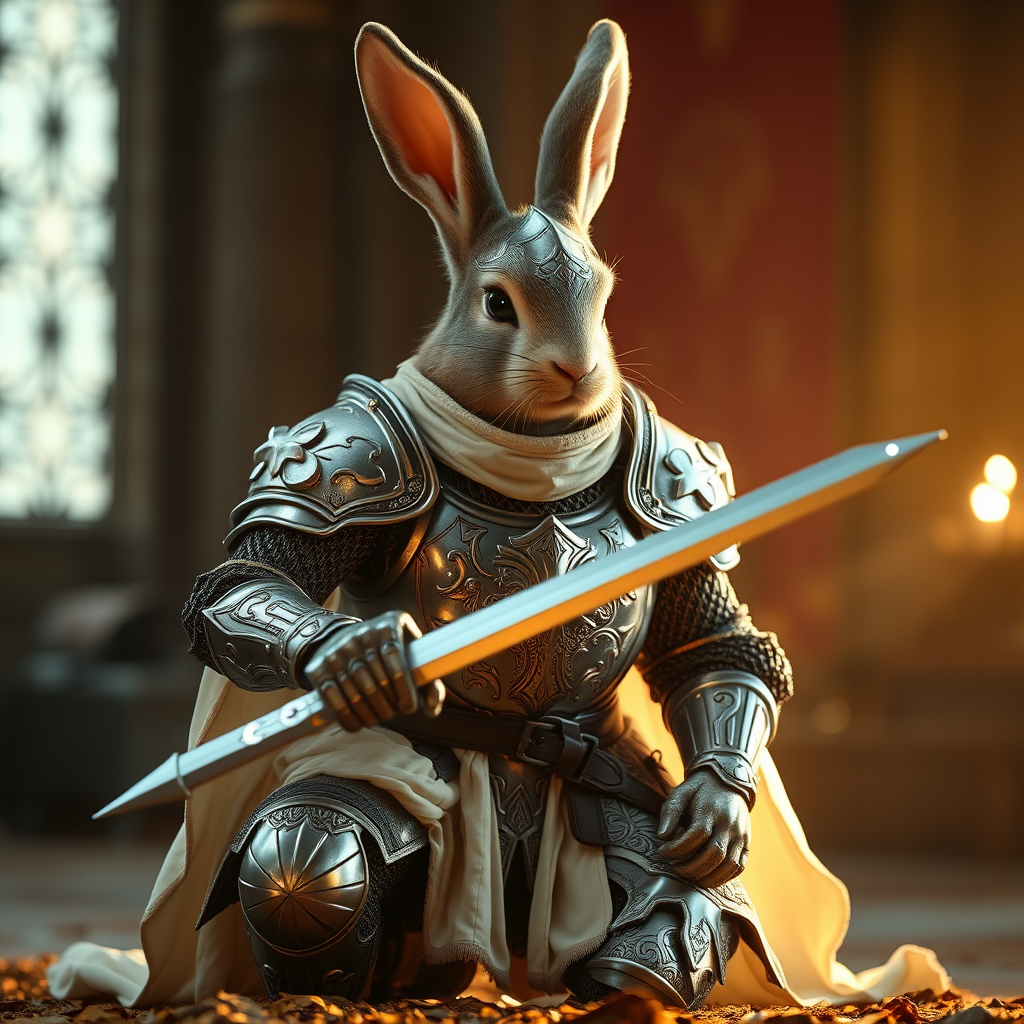 Heroic rabbit knight in a kneeling pose, adorned in meticulously crafted armor with elaborate patterns, silver sheen, and hints of soft silk. Captured in striking cinematic lighting, in an ultra-high definition, radiating an aura of nobility and courage.