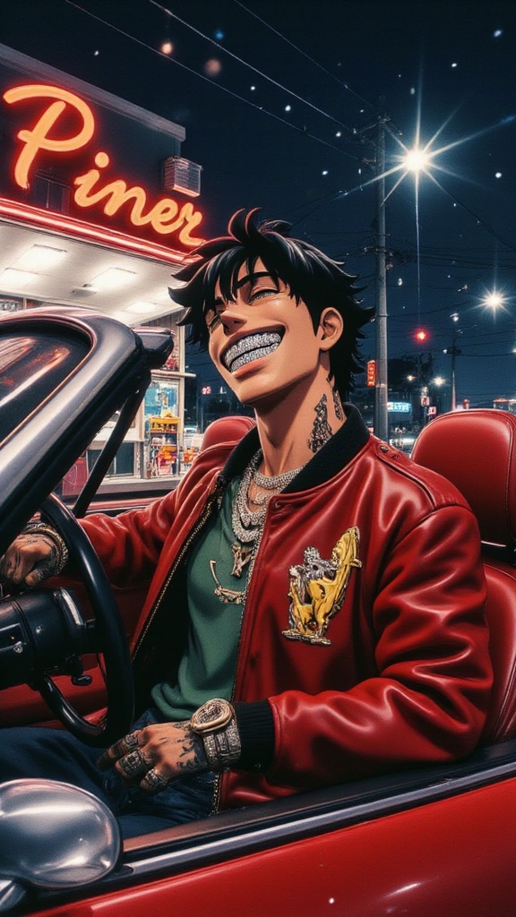 View this AI-generated image featuring hes wearing gr llz in his mouth with a large smile vintage anime diner man driving a red ferrari parked outside wearing a letterman jacket and leather gloves neon lighting retro. Created using advanced AI technology, this image showcases anime style. Perfect fo