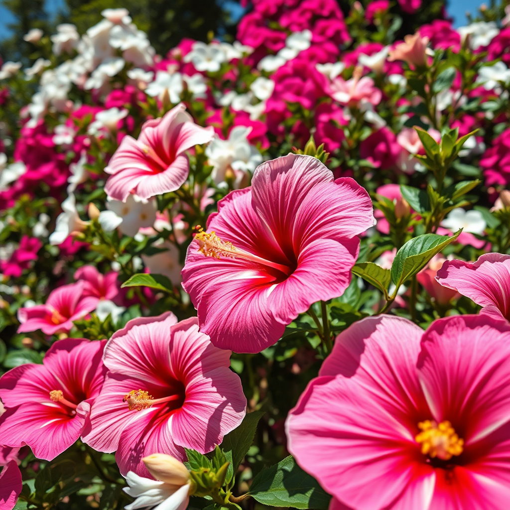 Hibiscus blossoms flourish amidst a vibrant flower garden, set against a backdrop of striking white and pink hues. The scene is captured with the precision of a DSLR using a 35mm lens, showcasing vivid color grading in direct sunlight that casts intricate shadow effects. Shot at f/18 from a low-angle viewpoint, the image boasts an 8k resolution for a photorealistic, hyper-detailed close-up, enhanced by the play of uplight to highlight every delicate petal and texture.