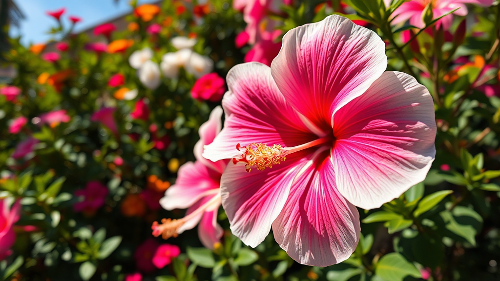 Hibiscus blossoms in full bloom set against a vibrant flower garden backdrop, showcasing striking white and pink hues. The scene is enhanced with dynamic color grading, captured with a DSLR using a 35mm lens. Direct sunlight casts intricate shadow effects, with an aperture of f/18 ensuring sharp focus. Shot from a low angle in stunning 8k resolution, the image is photorealistic and hyper-detailed, featuring a close-up perspective and gentle uplighting for a dramatic effect.