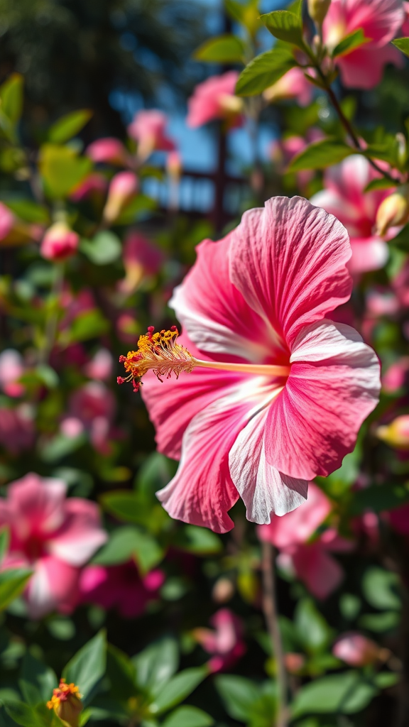 Hibiscus flourishing in a vibrant flower garden setting, featuring shades of pink and white. Captured with vivid, expertly graded colors, this DSLR 35mm photograph showcases the intricate beauty of the hibiscus in direct sunlight, highlighting nuanced shadow effects. Shot at f/18 from a low angle, the composition is hyper-realistic and detailed, presented in 8k resolution. The close-up perspective is enhanced by subtle uplighting, offering a fresh perspective on a classic floral subject, maintaining the 16:9 aspect ratio.