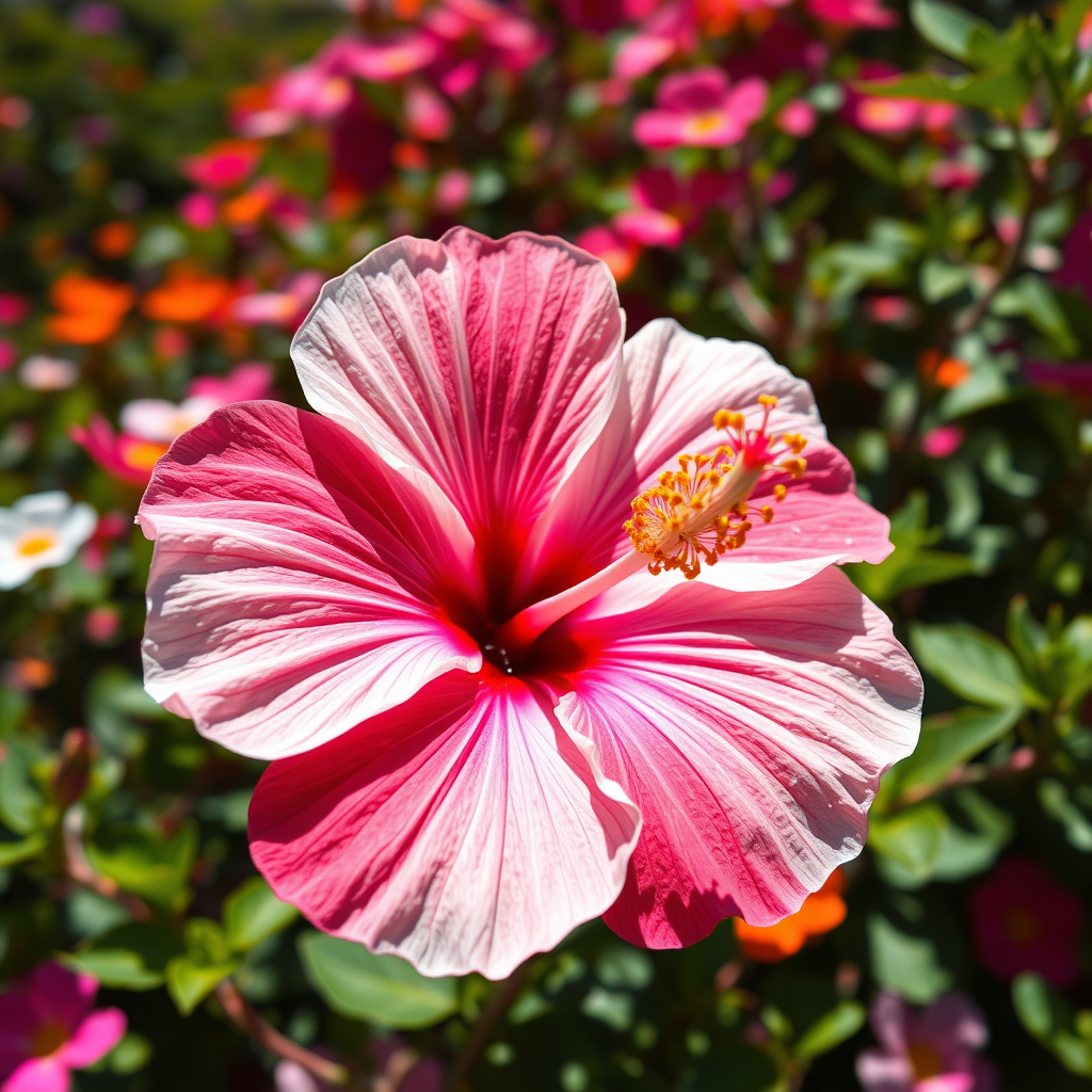 Hibiscus in full bloom with a vibrant flower garden background, showcasing vivid shades of white and pink. The image features expert color grading captured with a DSLR using a 35mm lens. Bathed in direct sunlight, the composition includes captivating shadow effects at f/18, captured from a low angle. This hyper-detailed, photorealistic close-up is in stunning 8k resolution, enhanced by subtle uplighting to emphasize the intricate textures of the petals, maintaining an aspect ratio of 16:9, with enhanced depth and clarity.