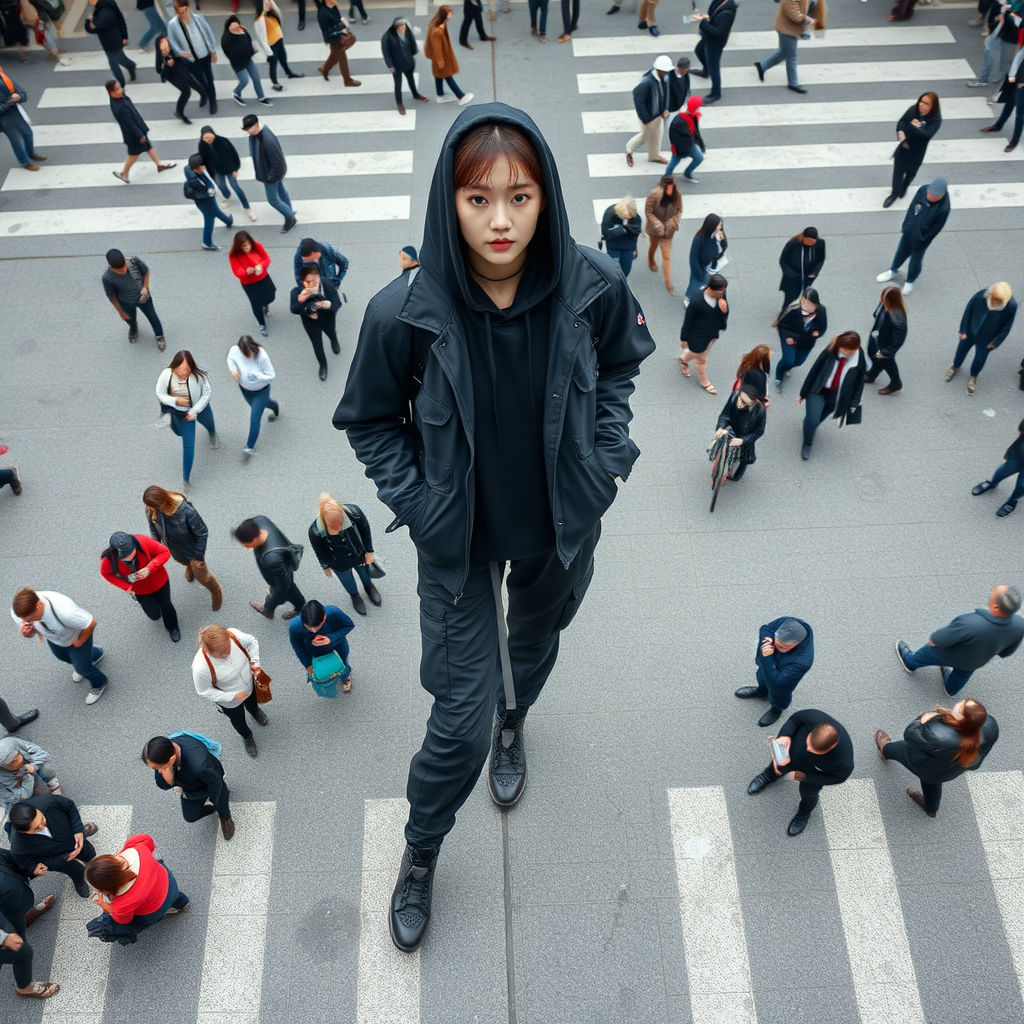 High aerial view of a Korean model positioned at the heart of a complex crosswalk reminiscent of Shibuya's scramble, confidently gazing into the camera. She's dressed in modern techwear featuring a sleek black safari-style jacket layered over a thick black hoodie, paired with black cargo jogger pants. Her look is completed with dark grey tactical boots. Amidst a bustling crowd, her attire stands out with its urban edge.