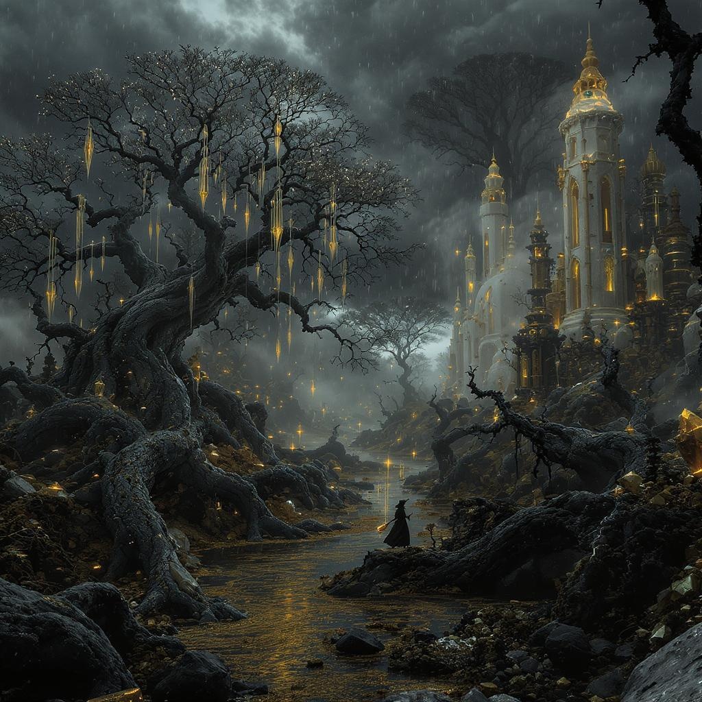 High contrast forest shrouded in fog, where witches wander under blowing lights. Deformed trees sketch mystic scenes against water, surrounded by industrial elements. Gold crystals and jewels sparkle like hidden gems in this fantastic world, blending cyberpunk and steampunk influences. The landscape feels like a detailed concept art piece from Alice in Wonderland, with loud clouds heralding an impending storm. Modern architecture stands beside old structures of ivory and marble, creating a paradise that's mind-blowing in 4k, a true masterpiece. Organic rust weaves through the elements. Rendered in octane, the scene blurs the line between reality and fantasy, inspiring awe with its intricate details and high contrast.