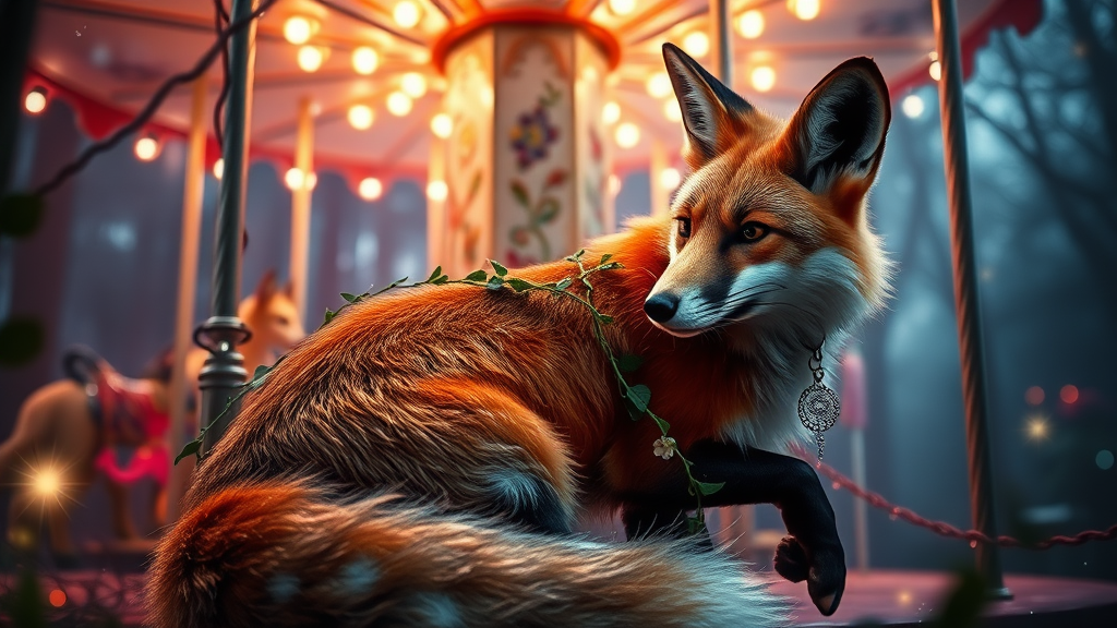 High-contrast RAW color photo of an award-winning fox rendered in photorealistic digital art, with intricately detailed ears and tail, lush fur, partially draped in ethereal vines, amidst an enchanted carousel in a misty forest, fantasy setting, heightened saturation, aurora-inspired backlighting, mesmerizing bloom, subtle chromatic aberration, silky smooth focus, captured on a high-end mirrorless camera at the highest quality setting, produced as a masterpiece reaching 12k resolution, finest HDR treatment, shimmering light sparks and starlight effects.