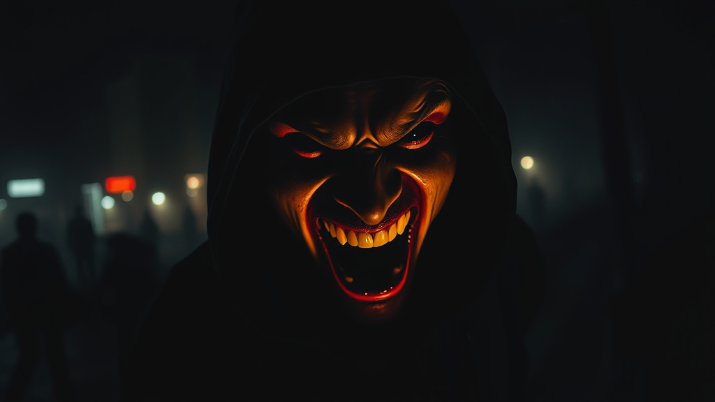 high-contrast, surreal, deceptive, photographs, manic laughter echoing, mysterious figure, dramatic lighting effects, thick, splattered, blood, complex, psychological, thriller, evil grin, imposing, silhouette, dark, apocalyptic, wasteland, ultra-detailed, cinematic, deep space, fusion of reality and nightmare, sharp focus, disappearing into shadows, unsettling atmosphere, reminiscing of Donnie Darko's eerie, investigator stalking suspect, prisoner broken free, dense, urban, nightfall, segmented, crime scene investigation