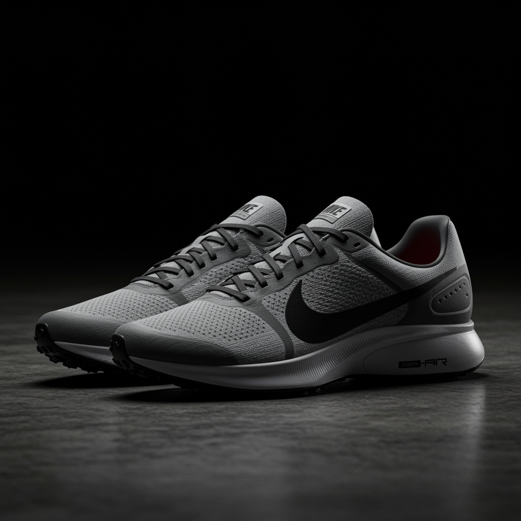 High-definition image of sleek Nike pace shoes crafted from rubber and composite fibers, showcasing a prominent black Nike logo. The photography, inspired by Steven Meisel, features exquisite lighting with an indirect glow, capturing the shoes in a visually captivating manner. Rendered with Unreal Engine and Octane for superior quality, these shoes are displayed in an elongated 2:3 aspect ratio, embodying an IQ of 180.