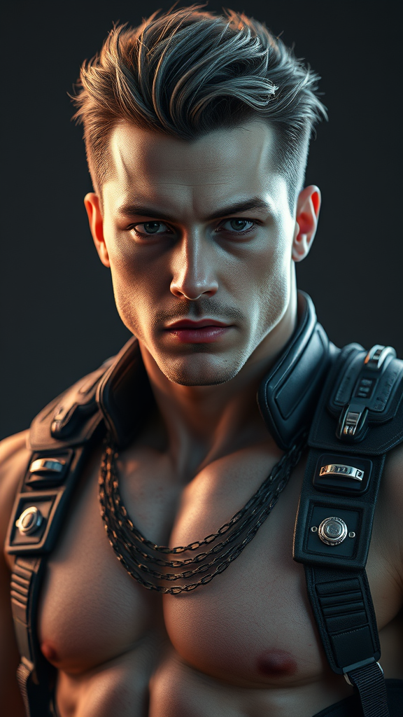 High-definition, photorealistic, male portrait with intense ambient occlusion, dynamically lit skin, and realistic mannequin-style clothing adorned with intricate, metallic accents, set against a stark, sci-fi background, rendered in 8k resolution with hyper-realistic details on every plane of the subject's powerful, athletic body, while his maxillaries are shaded with finely nuanced colors mesmerizingly intricate hair, voicing a solemn, epitome of masculinity.