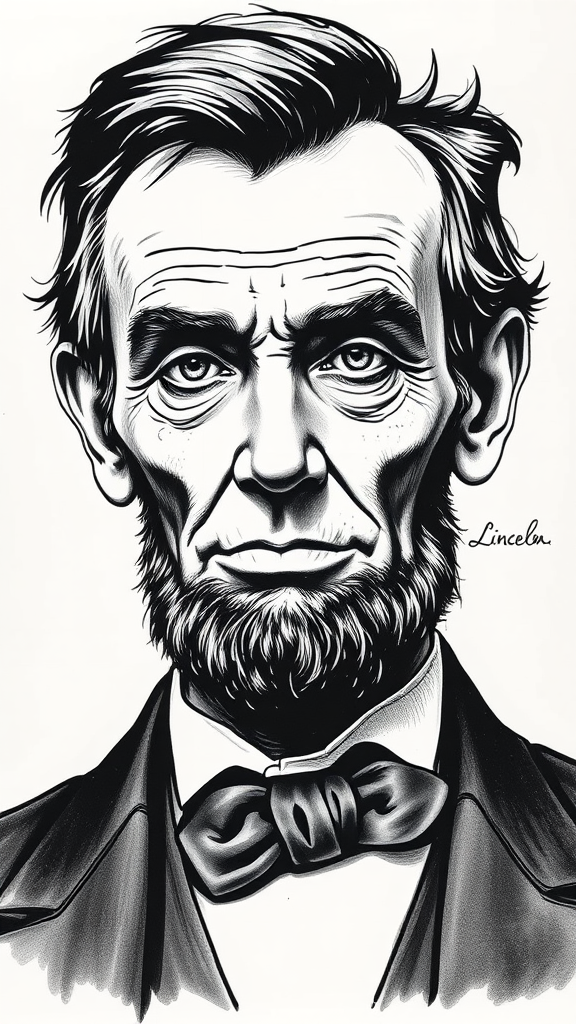 High-definition portrait, ink medium, Abraham Lincoln, character isolated on blank background, with intricate details and slight imaginative alterations to enhance character depth.