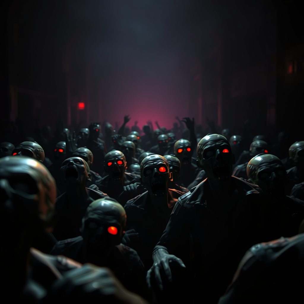 High-definition screenshot from an animated film featuring a horde of zombies, crafted in a 3D, CGI style. The scene conveys a sense of horror, utilizing a dark color palette with an emphasis on contrasting shadows and foreboding highlights, infused with cinematic lighting to enhance the eerie atmosphere. Subtle, vibrant tones are interspersed to accentuate key elements, adding depth and a touch of surrealism to the composition.