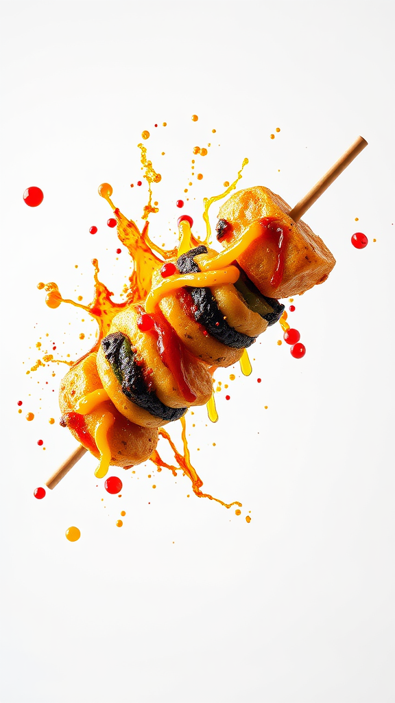 High-definition studio photography of a dynamic splash of a colorful kebab, expertly captured with precise white lighting, showcasing its vibrant textures and intricate details against a pristine white backdrop. Utilizing advanced 8k rendering, the image highlights the kebab's fine details, emphasizing the professional color grading for a polished, commercial stock photo appearance, --aspect ratio 9:16.