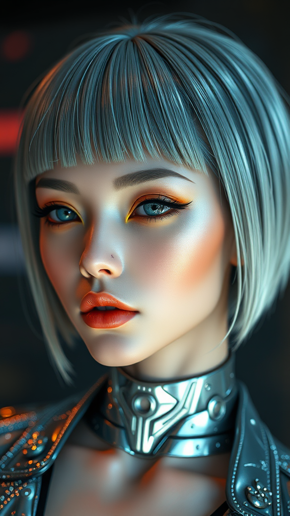 High-definition, unparalleled masterpiece, exquisite art, 8K resolution, sleek medium and short hair, pearl shimmer, futuristic cyberpunk aesthetic, cutting-edge fashion trends, 3S materials, high-definition detail, cinematic performance, C4D, advanced 3D design, octane rendering, ray-traced illumination, intricate detailing, dynamic lighting animation, OCrenderer, immersive 8K visuals.