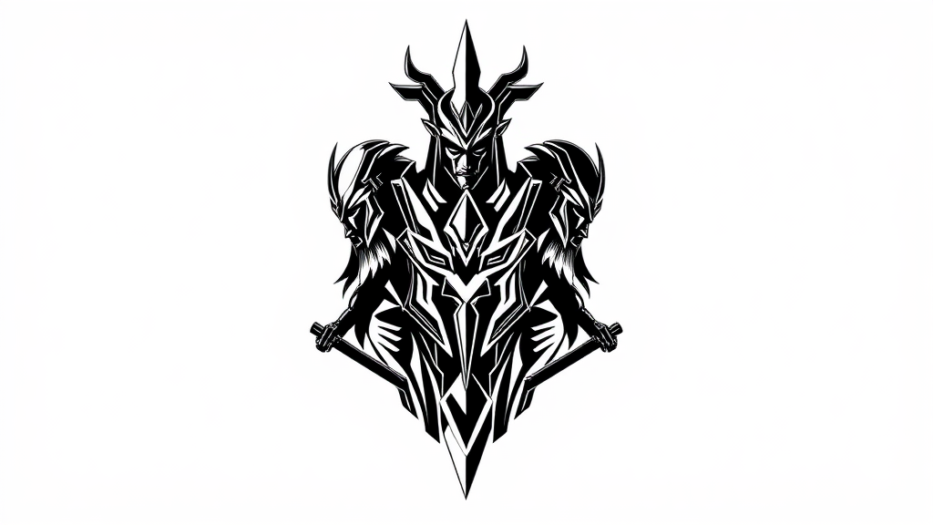 High detail logo of warriors crafted in black metal with geometric influences, featuring symmetry and realism, designed as a vector in black and white, includes elements of ray tracing, exceptional detail quality, 8k resolution, maintaining a 1:1 aspect ratio, creatively modified without the incorporation of letter V.