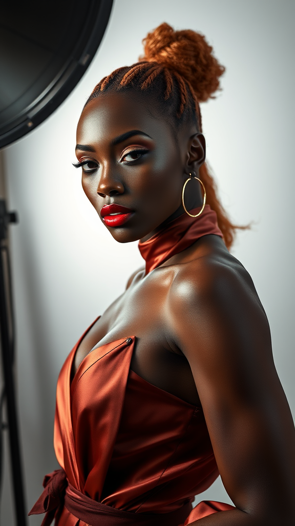 High-end studio fashion full-body photo capturing a breathtaking black albino female model exuding strength and confidence with her striking, chiseled features and athletic physique. Her makeup is naturally radiant and minimalistic, enhancing her skin’s natural glow with a dewy finish. Her eyes are highlighted with a subtle smoky effect, while her lips stand out in a vibrant Crimson-Red hue. She's dressed in luxurious, fashion-forward attire, embodying the latest trends with elegance. The lighting setup includes a large softbox positioned at a 45-degree angle above and to the model’s side, complemented by a smaller reflector on the opposite side and a hair light behind and above her. The background is softly illuminated to complement the scene. Shot with a Canon EOS R5 using a Canon EF 85mm f/1.2L II USM lens at f/2.8 aperture, the photograph delivers a cinematic and stylish aesthetic with creative nuances woven into the core concept.