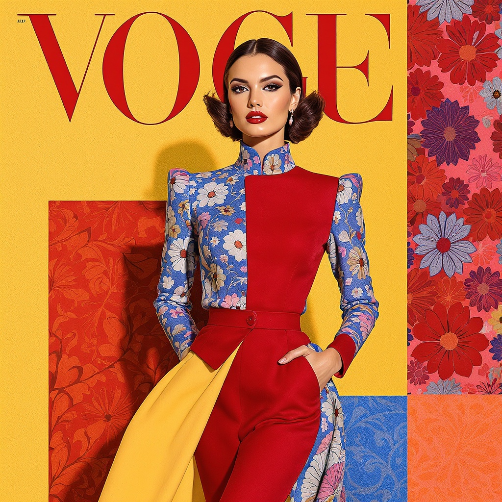 High fashion editorial, inspired by Vogue 1967, featuring bold geometric squares and intricate flower patterns; vivid colors and sharp details; model in striking pose exuding elegance and sophistication; flawless anatomy and expressive features; crisp, clean lines and a sleek, polished finish.