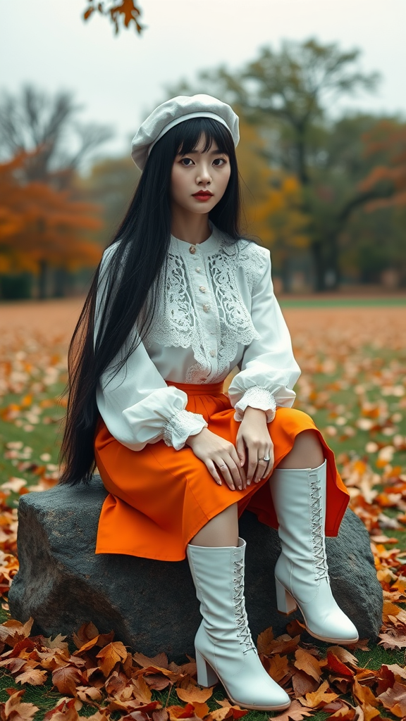 High fashion editorial featuring a stunning Asian woman with long, silky black hair and chic bangs framing her radiant face. Her dark, captivating eyes and full, natural lips are complemented by light, expertly applied makeup, emphasizing her ethereal beauty. She dons an intricately detailed, elegant white blouse paired with a sophisticated white beret and a striking burnt-orange skirt. Her stylish ensemble is completed with pristine white boots, exuding modern elegance. Seated gracefully on a large rock in a serene park, she is surrounded by the vivid hues of autumn, with colorful leaves blanketing the ground. The atmosphere of the scene is overcast, lending a soft, dismal light that enhances the overall mood. The depth of field focuses on the model, creating a sharp, professional, and magazine-worthy image. The entire setup radiates a trendy, stylish vibe, capturing the essence of contemporary high fashion amidst a tranquil natural setting.