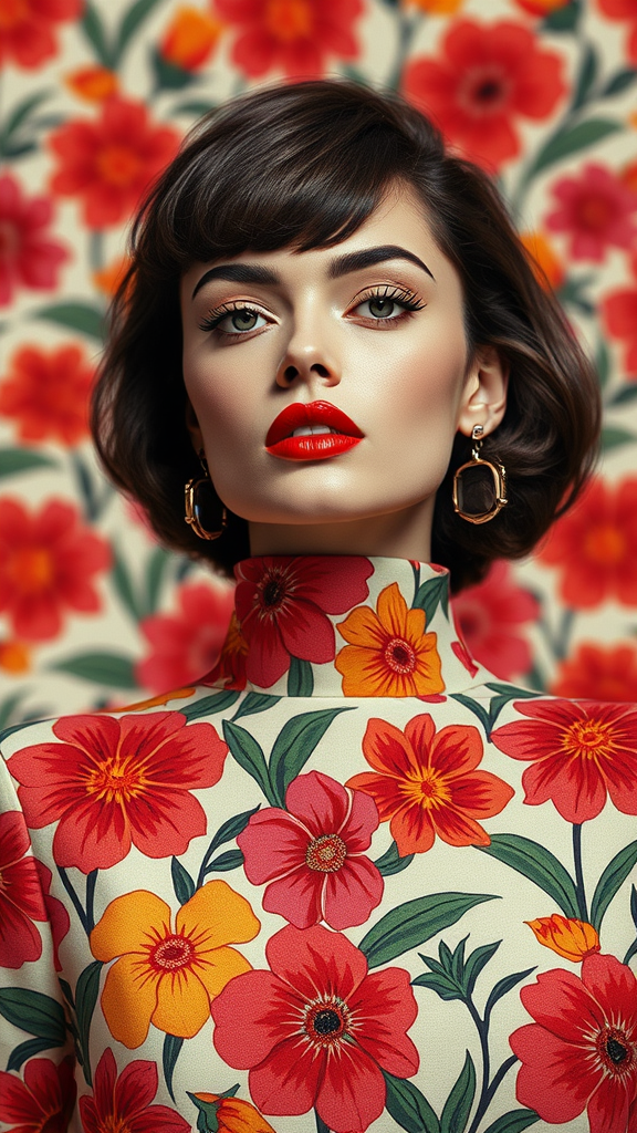 High fashion editorial featuring bold geometric squares and vibrant flower patterns, inspired by 1967 vogue aesthetics; flawless, sharp details; intricate design; stylish, elegant poses; harmonious color palettes; emphasis on clarity and precision; smooth outlines and perfectly proportioned features; a celebration of retro sophistication and modern chic.