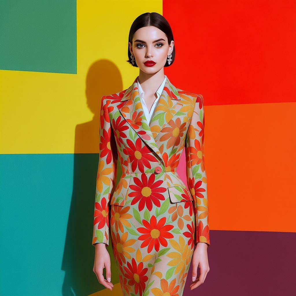 High fashion editorial featuring vibrant 1967-inspired design, showcasing a sleek, tailored silhouette adorned with a bold, geometric flower pattern. Set against a backdrop of abstract squares, the model exudes an effortless elegance. The imagery is sharp, focused, and vividly colored, capturing the essence of iconic style and sophistication.