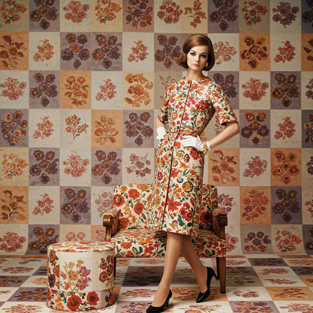 High fashion editorial inspired by 1967, featuring geometric squares adorned with vibrant flower patterns, capturing a vintage Vogue aesthetic. The scene exudes elegance with a focus on sharp, clear visuals and flawless design, avoiding any distortions or imperfections. The ensemble is meticulously styled, showcasing impeccable anatomy and graceful poses amidst a backdrop that complements the vibrant, retro allure.