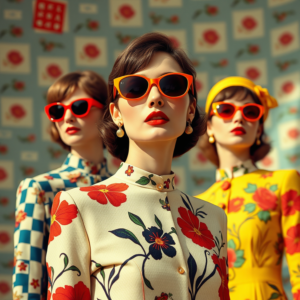 High fashion editorial set in 1967, featuring models styled in chic outfits inspired by vintage Vogue aesthetics. The scene is adorned with bold square patterns and intricate flower designs, embodying the swinging sixties. The atmosphere is crisp, vibrant, and strikingly clear, capturing the essence of classic elegance and precision. The composition focuses on immaculate style and flawless anatomical detail, radiating a sense of timeless sophistication.