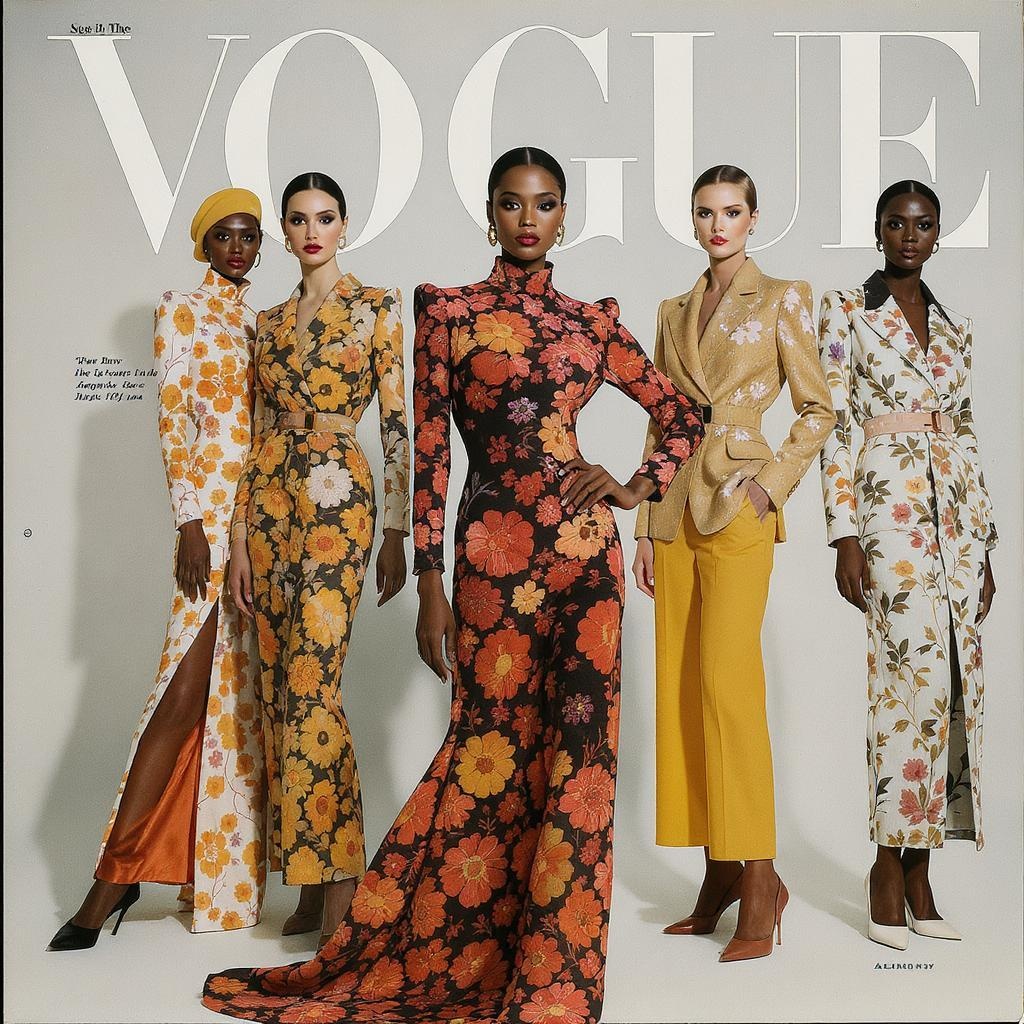 High fashion editorial with a 1967 vibe, featuring elegant models dressed in bold, structured outfits adorned with intricate flower patterns. The scene is set against a backdrop of chic, minimalist squares, epitomizing the essence of a vintage Vogue spread. The composition is clear and precise, capturing sharp details and flawless anatomy, highlighting graceful poses and expressive faces, all contributing to a polished and visually stunning presentation.