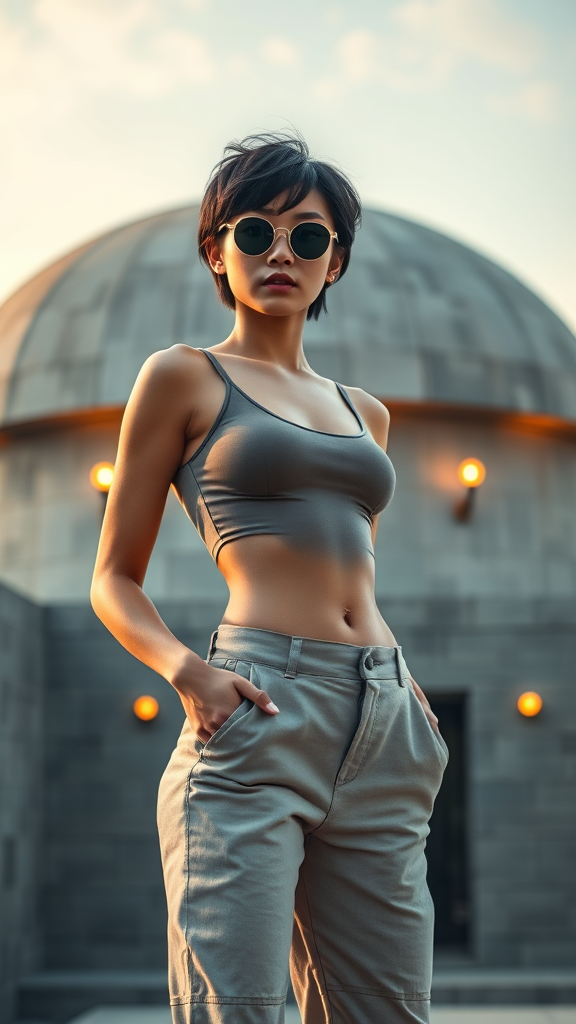 High fashion photo of a slender young Asian female supermodel with a flat-chested build, short tousled black hair, wearing a raw concrete-hued bodysuit that reveals her toned midriff, paired with Brutalist asymmetrical pocket trousers and round sunglasses. She poses against a backdrop of a raw concrete observatory dome, illuminated by the warm glow of brutalist-inspired lamps. Soft natural lighting accentuates her features, set in the dreamlike ambiance of Mirage City.