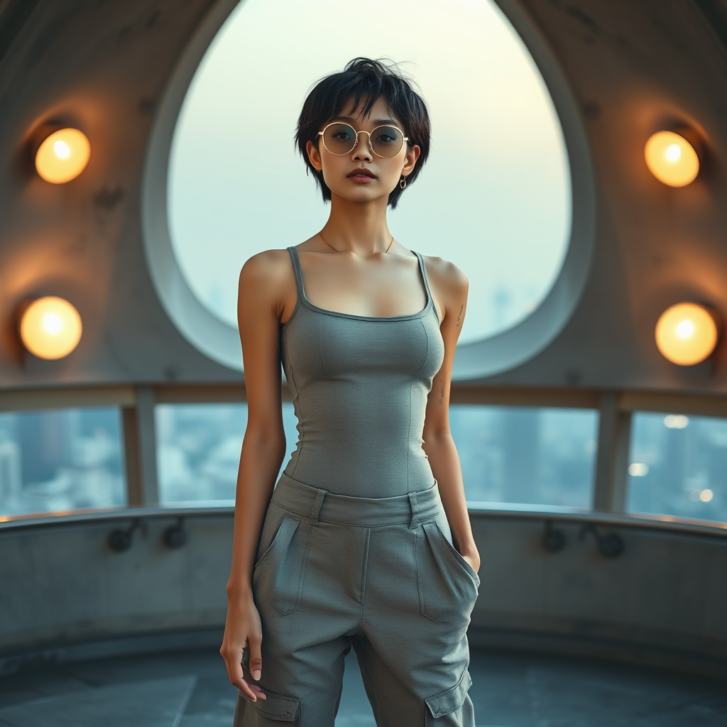 High fashion photo of a slender, youthful Asian female supermodel with short tousled black hair; wearing a minimalistic concrete-toned bodysuit that highlights her athletic build and subtle curves, paired with avant-garde asymmetrical trousers featuring unique structural pockets; accessorized with sleek round sunglasses. She stands against the backdrop of a futuristic concrete observatory dome, illuminated by the soft glow of brutalist-inspired lamps, with gentle natural lighting reflecting the ethereal ambiance of Mirage City's skyline.