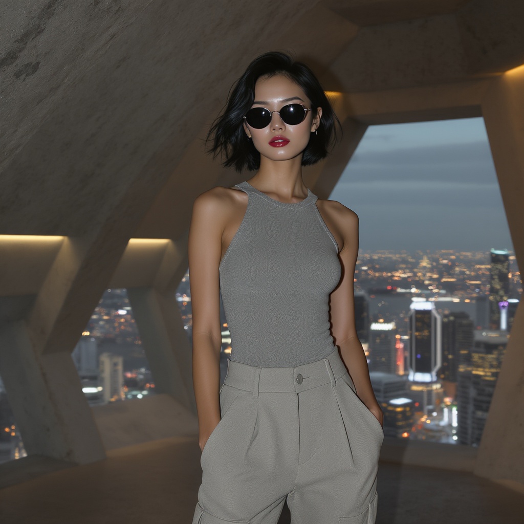 High fashion photograph of a slim, petite young Asian female supermodel with a flat chest and defined abs. She flaunts short, tousled black hair while wearing a raw-edge concrete-hued bodysuit. Her outfit includes Brutalist asymmetrical pocket trousers paired with round sunglasses. The setting features a raw concrete observatory dome in the background, illuminated by glowing lights from Brutalist-inspired lamps, casting a gentle, natural glow on the model in the futuristic cityscape of Mirage City.