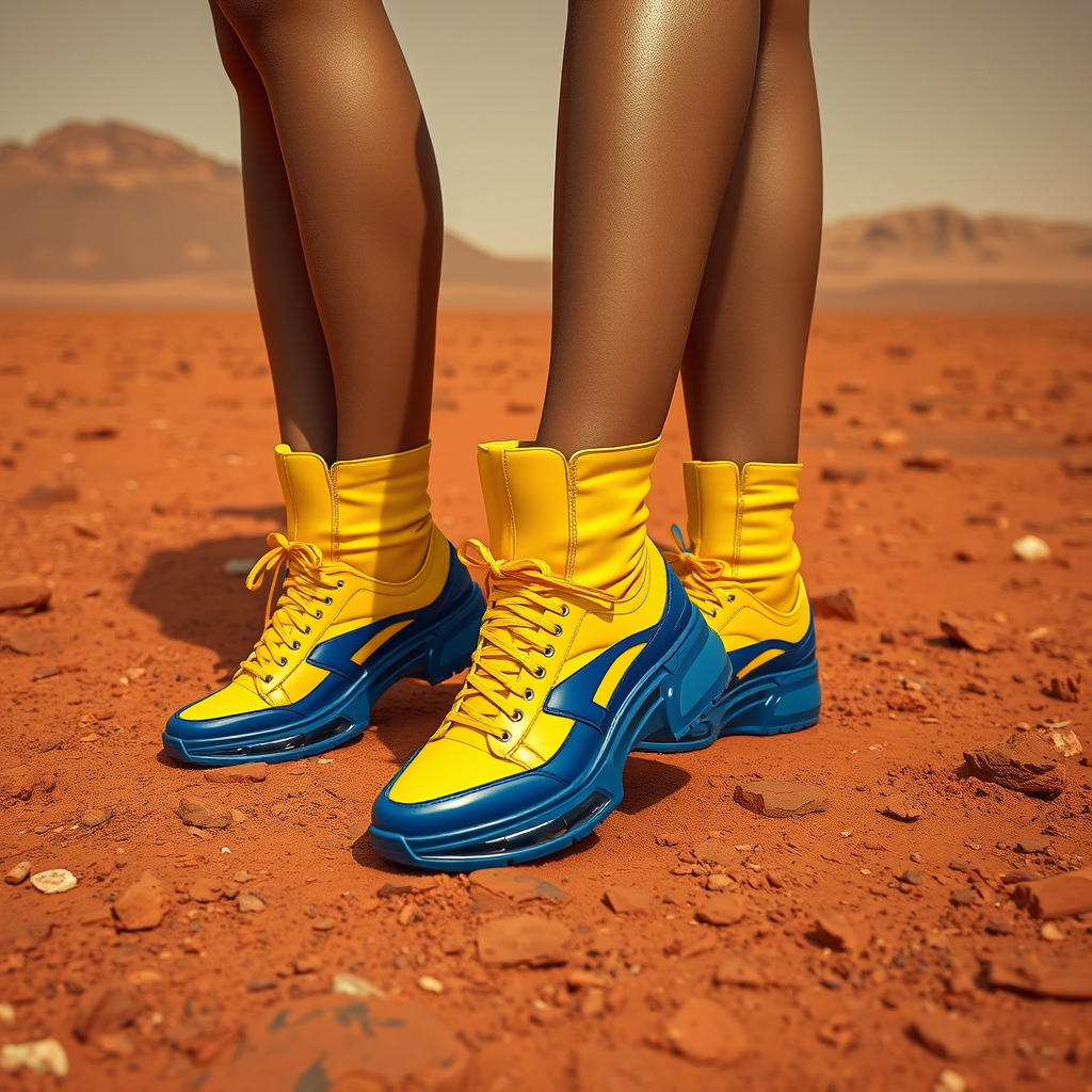 High-fashion photoshoot featuring models wearing vibrant yellow and deep blue shoes, set against the backdrop of the Mars landscape. This professional, high-resolution, 8k image showcases a renowned brand's footwear in a photorealistic style, capturing the contrast of bold colors amidst the red Martian terrain, evoking a sense of futuristic elegance.