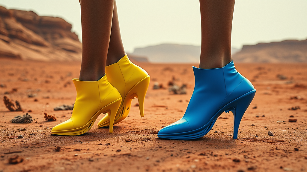 High-fashion photoshoot featuring two pairs of striking yellow and blue shoes elegantly worn by models, set against the dramatic red landscape of Mars. Captured in stunning 8k resolution, this professional photography highlights the brand's innovative design and futuristic style, showcasing photorealistic detail and vibrant colors with an aspect ratio of 4:5.