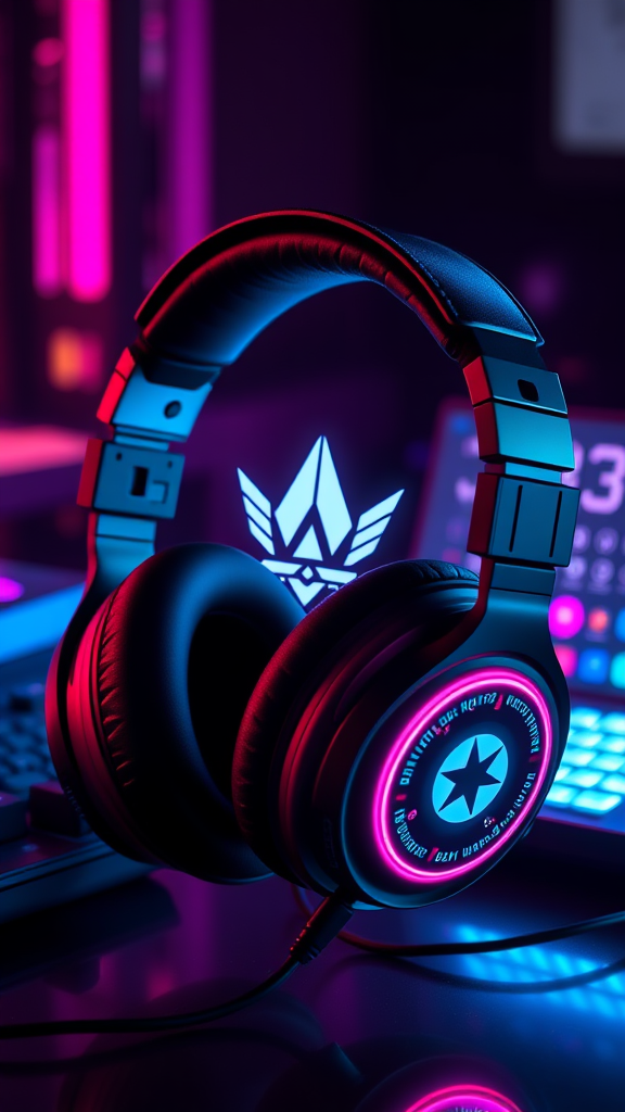 High-fidelity headphones | gaming emblem | sleek branding | refined design | digital toolkit | vaporwave vibes | stylish visuals | ultra-high resolution | detailed graphic | digital enhancement | surreal enhancement.