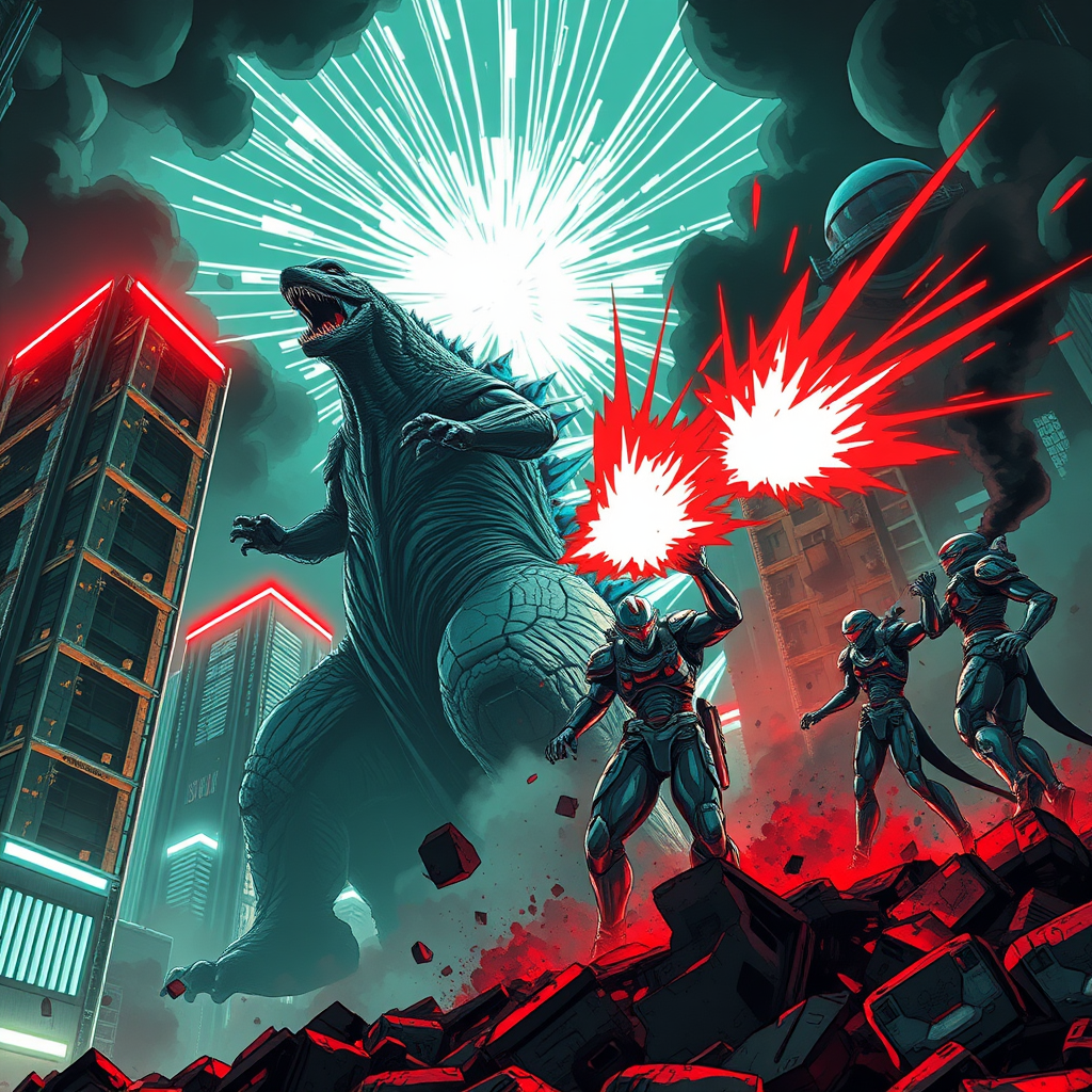 High ground angle shot of towering skyscrapers set on low ground, as an enraged King Kong Godzilla roars fiercely. Creatures in futuristic, organic armor burst into action, emanating a radiant white and red aura while unleashing devastating attacks. Neon lights illuminate the scene in a detailed anime style, reminiscent of FW Murano. The creatures are clad in full-body GALAXY armor, standing amidst jet black plumes of smoke. The composition mirrors the style of Prokoko, emphasizing bold, expressive brushstrokes and vivid colors. CarnageStyle influences the scene with an intensity of 1.6, casting everything in a dramatic, blood-red hue. Cinematic lighting enhances the dynamic angle, capturing every extreme detail in this epic confrontation.