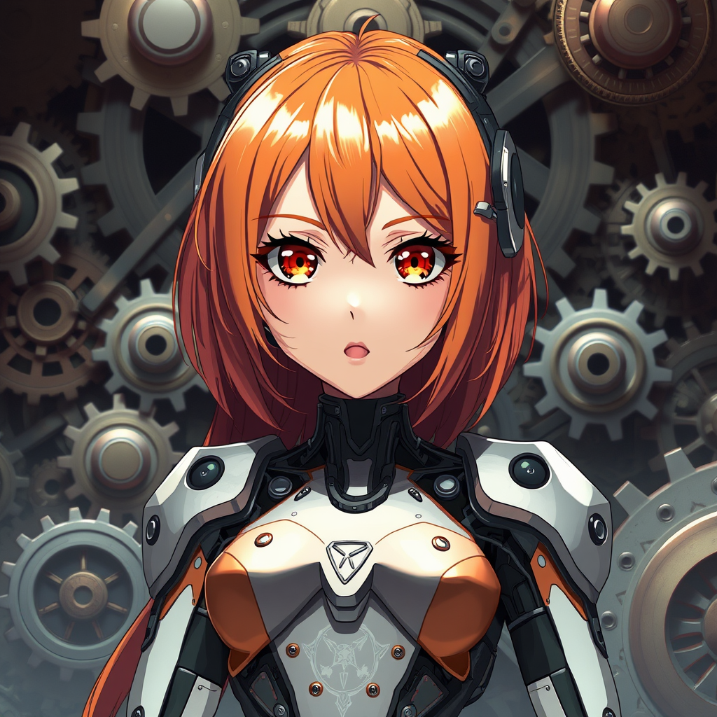 High-quality 2D illustration featuring an anime-style character with expressive eyes and a perfect face, capturing a full-body cinematic shot. The scene is Instagram-worthy with a dynamic pose. The character is a clockwork robot, combining cybernetic elements with biochemical steampunk aesthetics. She has striking orange hair against a background filled with intricate gears. The setting is influenced by "Ghost in the Shell," showcasing professional artistry with soft shadows and volumetric lighting.
