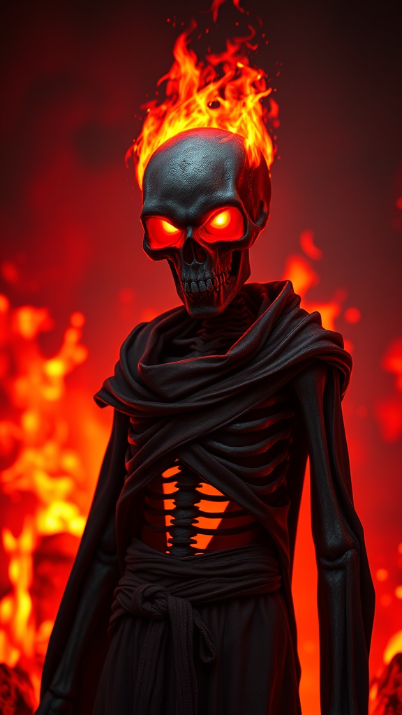 High quality 3D portrait rendering of a ghoul standing guard at the entrance to the underworld, featuring a fiery skull with glowing ember-red eyes. Its elongated, skeletal frame is shrouded in tattered cloaks. Richly detailed blazing infernos fill the background, casting flickering shadows that accentuate a dark fantasy horror theme, bathed in dramatic crimson and cinematic lighting. Features such as highly detailed flames serving as the backdrop create an intense atmosphere. The realism is further enhanced by a soft-focus effect set with an f/2.2 aperture. The art captures a mystical aura reminiscent of top-tier creations shared on platforms like ArtStation, emphasizing an immersive visual experience.