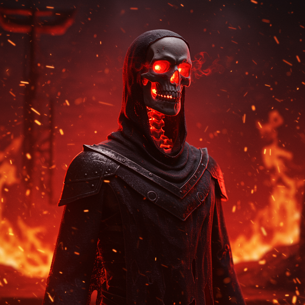 High-quality 3D portrait rendering of a ghoul standing vigil at the gates of the underworld. Its skull is engulfed in an eerie, hellish glow, and its eyes emit an intense red sparkle. The ghoul boasts a slender, imposing figure with a meticulously detailed skeleton draped in tattered ancient robes. The background is alive with dynamic flames and fire, creating a dramatic and dark fantasy atmosphere. The scene is illuminated with cinematic red lighting, casting deep shadows and creating a sense of foreboding. There are no horns, excessive facial features, or text to distract from the chilling focus. The composition captures a balance of horror and elegance, with soft-focus elements adding depth to the image.