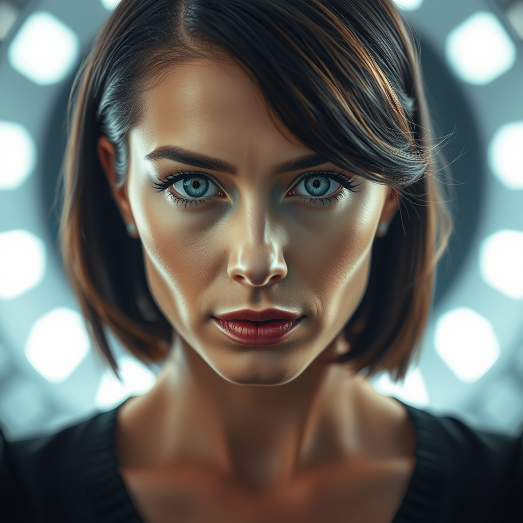 High quality, 4k, highres, masterpiece, ultra-detailed, realistic, portrait of a short-haired brunette woman standing in a silver light, striking blue eyes, sharp focus, complex, highly detailed, cinematic, candid, true colors, creative, pure, stunning, graceful, intricate, self-assured, dynamic, volumetric lighting, cinematic angle, radiant vibrance.