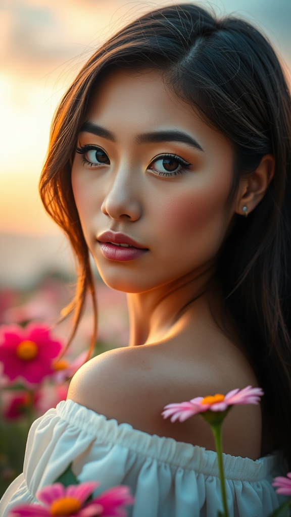 High quality, 8K, HDR, high resolution with a soft, blurry background and bokeh effect. Captivating professional photography capturing an individual in sharp focus against a gentle morning sky, elegantly posing amidst a vibrant flower garden for a photoshoot. Detailed, radiant skin and a strikingly beautiful face are highlighted, with clear, captivating eyes, intricately detailed pupils, and a touch of lip gloss accentuating a natural blush on the cheeks. Small, tasteful earrings add to the charm. Avoid elements resembling EasyNegative, low-resolution images, or standard quality depictions, while introducing unique artistic flourishes that enhance the overall concept.