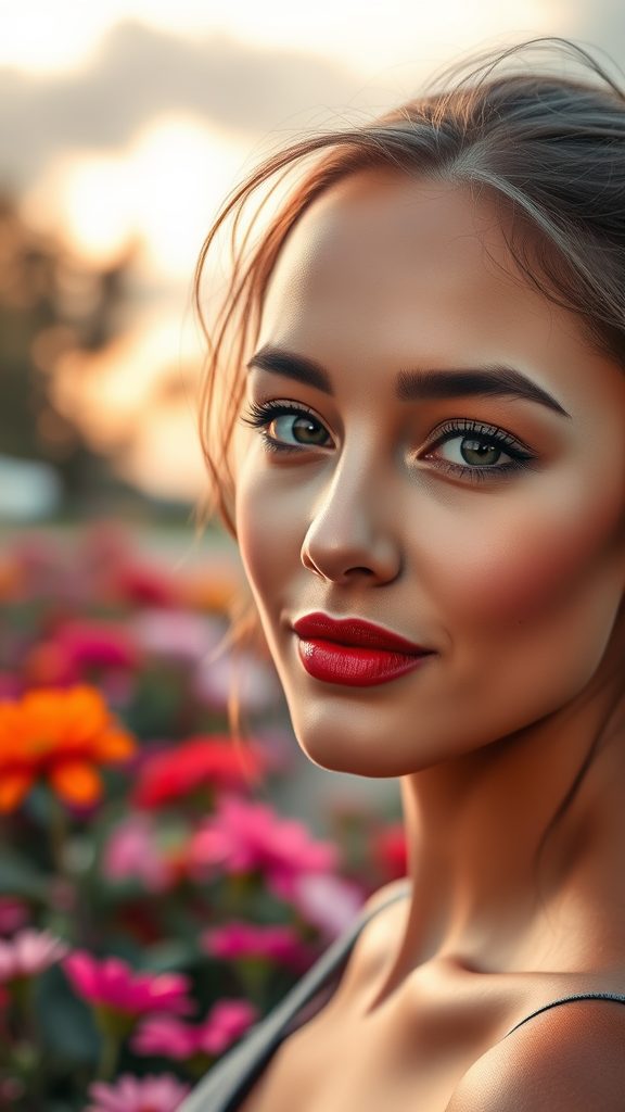 High-quality, 8K resolution, HDR, high-res, with a softly blurred background featuring bokeh effects, capturing professional photography. The subject is in sharp focus against a morning sky. Posing in a vibrant flower garden outdoors, as part of a photoshoot, the scene exudes natural beauty. The subject has richly detailed and radiant skin, with a beautifully sculpted face, and captivating, clear eyes with intricate pupil details. Their lips are accentuated with lipgloss, complemented by a soft blush on their cheeks. Small earrings add a touch of elegance. Avoiding distractions like paintings, sketches, or low-quality elements, this composition utilizes EasyNegative for optimal results and integrates small creative touches while maintaining the essence of the setting.